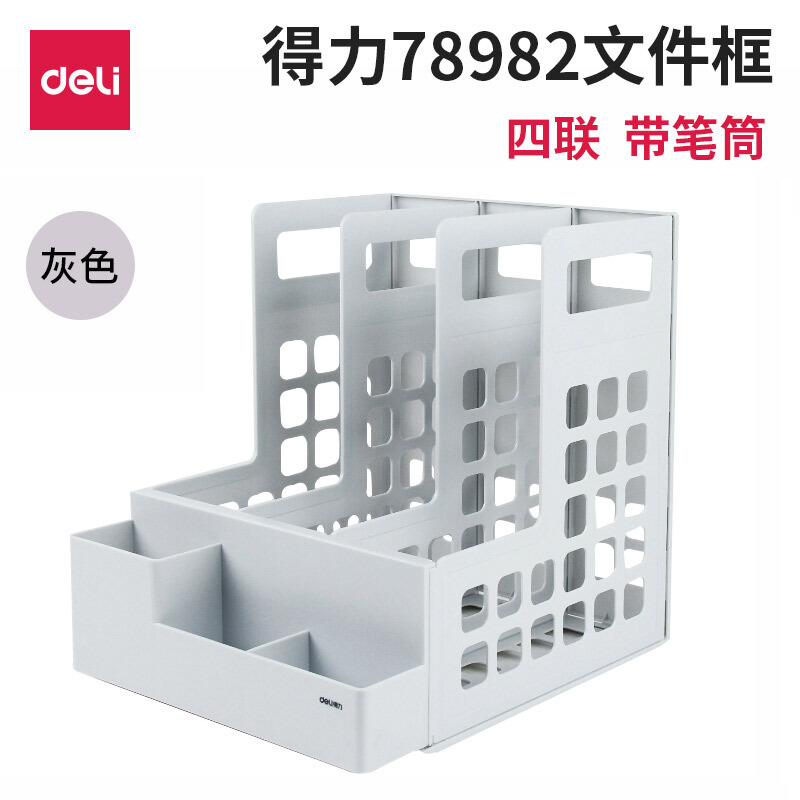 - 商品名称:得力文件框三栏桌面办公四联文件座多功能收纳架文件夹筐资料架子带笔筒三联浅灰78982