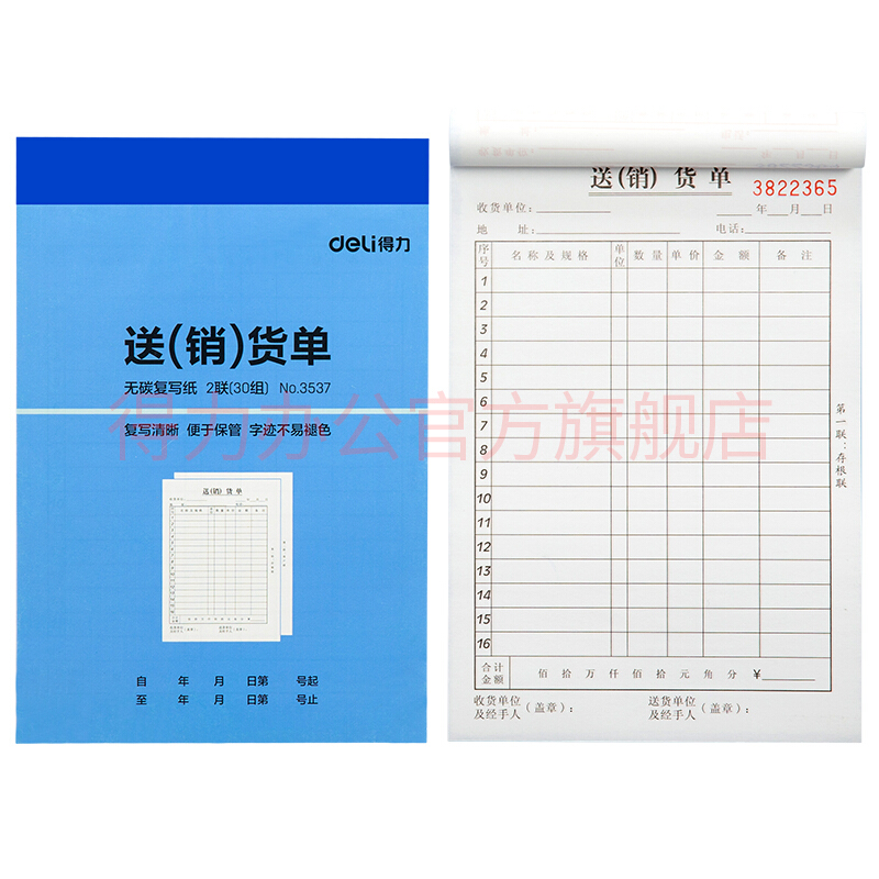 - 商品名称:得力(deli) 单据票据收据领料出库入库送销货单 无碳复写纸财务办公用品3536三联送(销)货单十本装