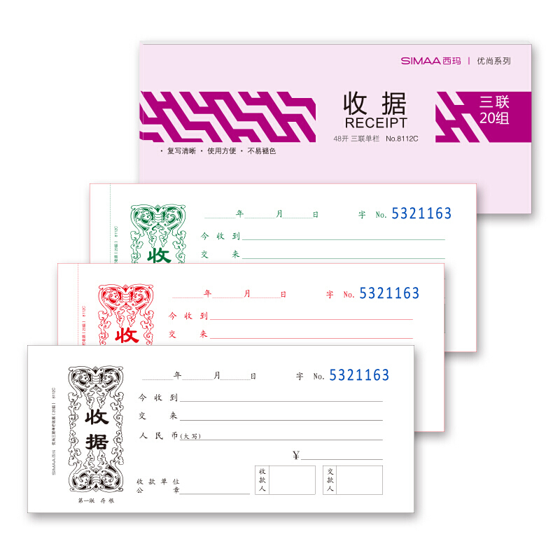 - 商品名称:西玛(SIMAA)三联单栏收据8112C 190*83mm 20组 10本装带撕裂线无碳复写收货收款单据