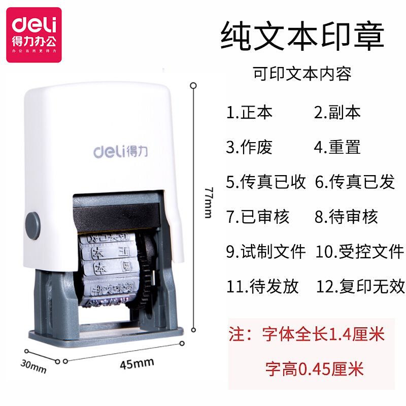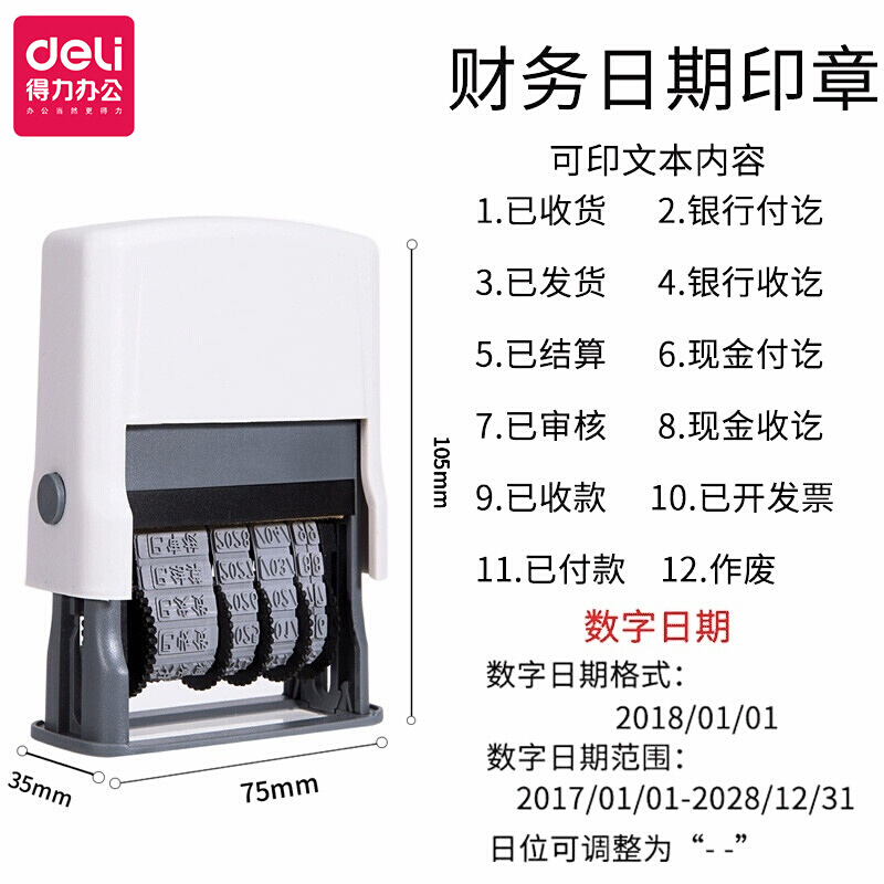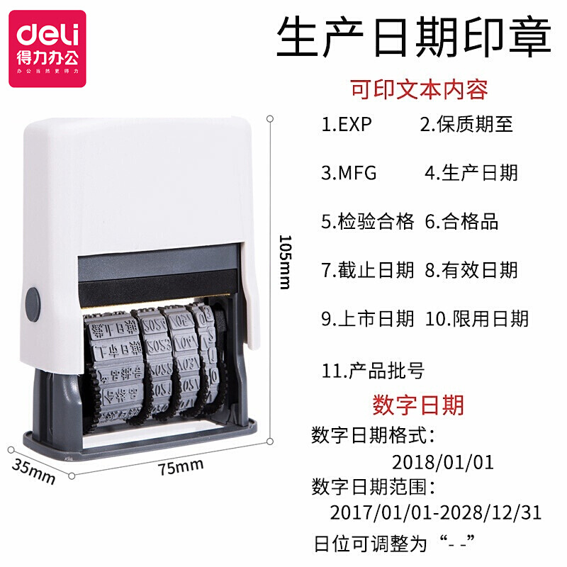 - 商品名称:得力(deli) 自动回墨 日期印章 时间印章年月日可调生产日期打码机11位实字日期印79952