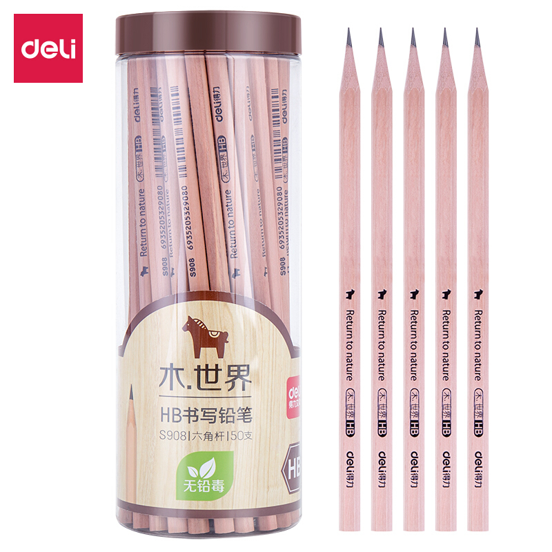 得力(deli)木世界系列六角笔杆原木HB铅笔素描绘图学生铅笔50支/桶S908