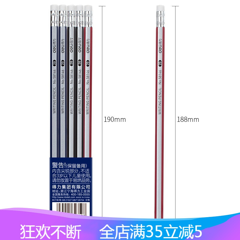 得力(deli)学生HB趣味算术六角笔杆书写铅笔 【12支/卡2B】带橡皮头款58136