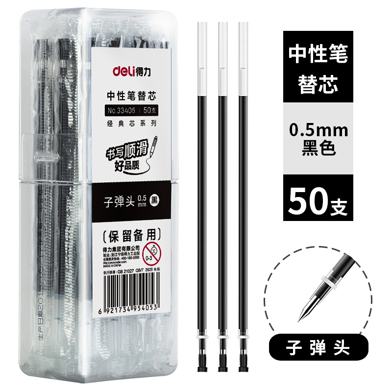 - 商品名称:得力(deli)0.5mm黑色子弹头中性笔芯 水笔签字笔替芯50支/桶33405