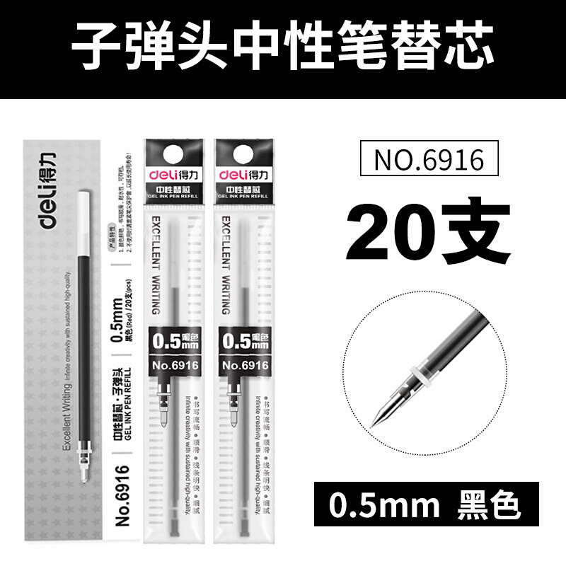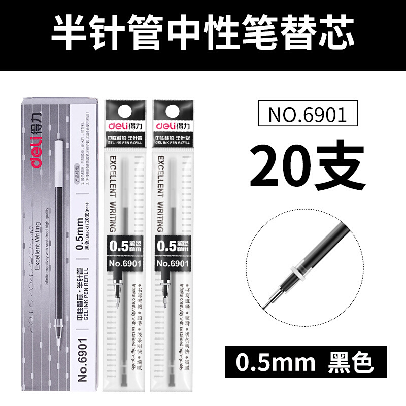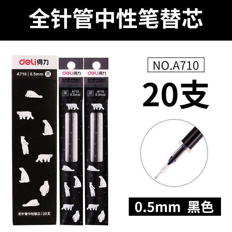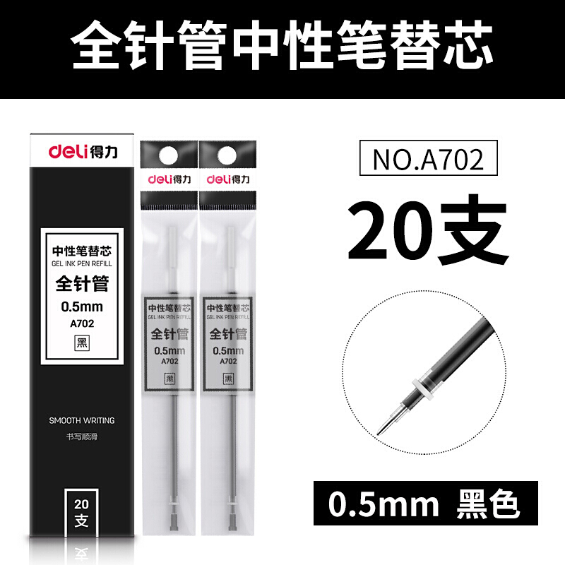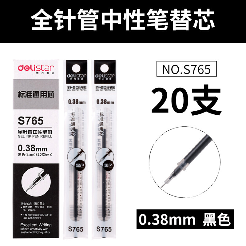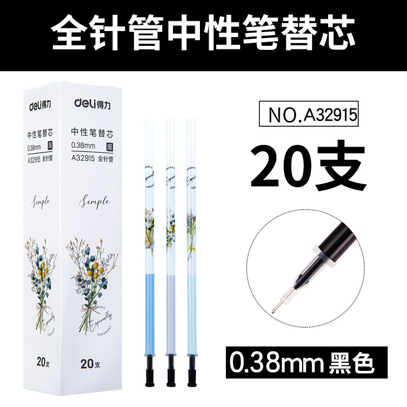 - 商品名称:得力中性笔芯批发0.5mm头黑色笔芯0.38替芯全针管水笔芯A32915黑色0.38全针管