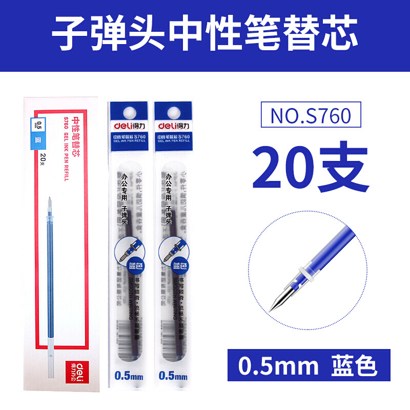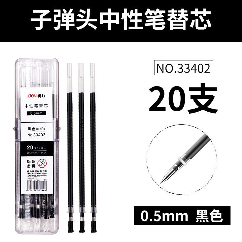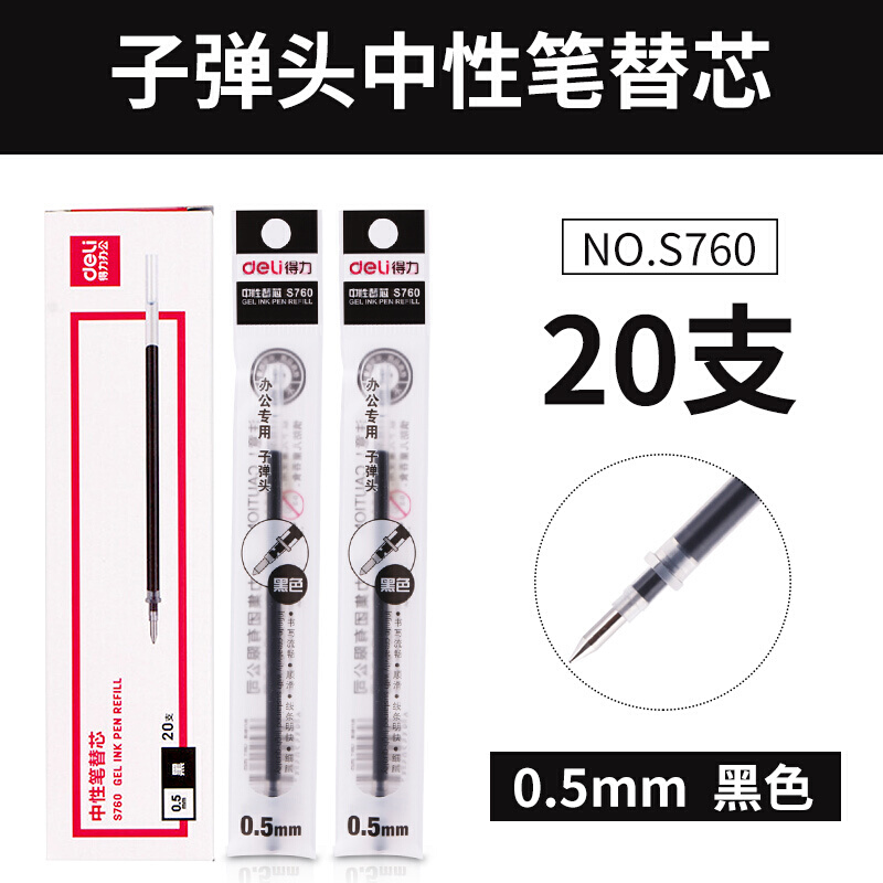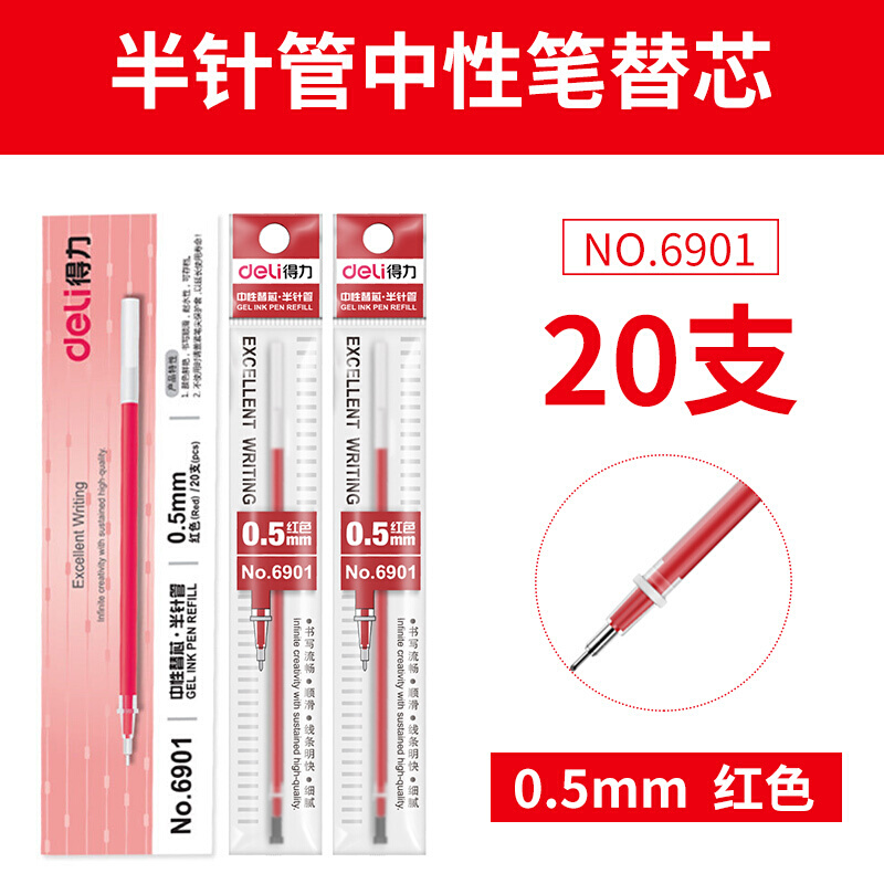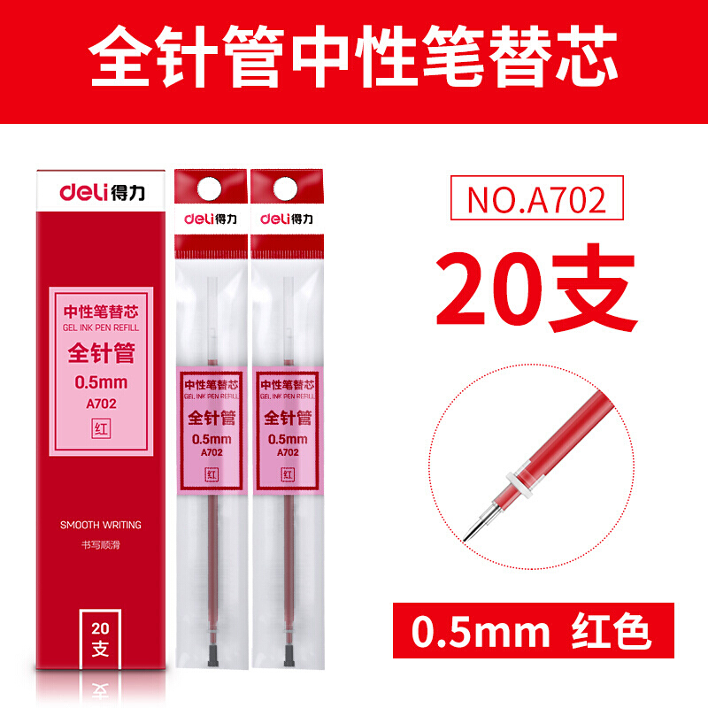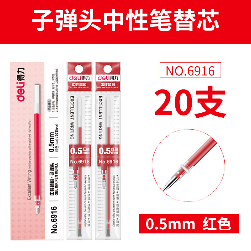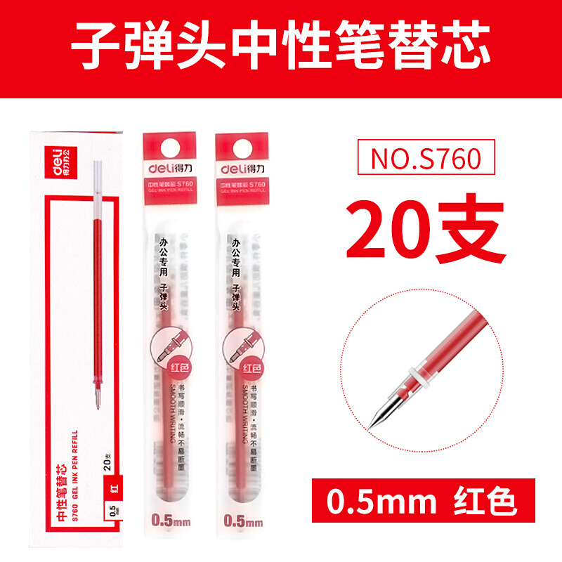 得力(deli)0.5mm红色中性笔笔芯 子弹头水笔签字笔替芯 20支/盒