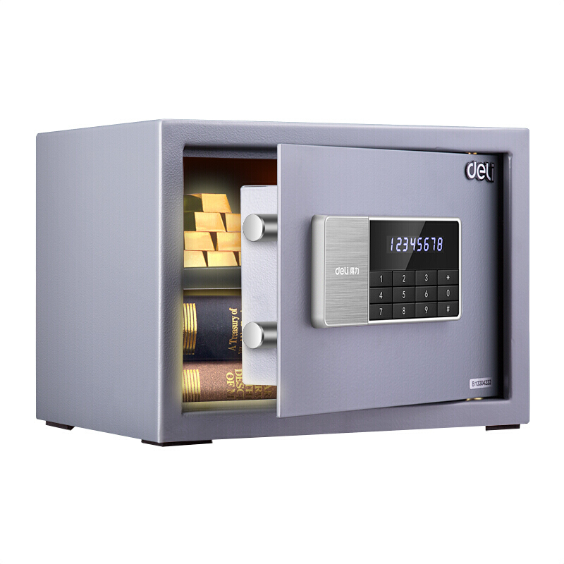 - 商品名称:得力(deli) 92619 金甲电子密码保管箱 双保险防盗 办公家用92619灰
