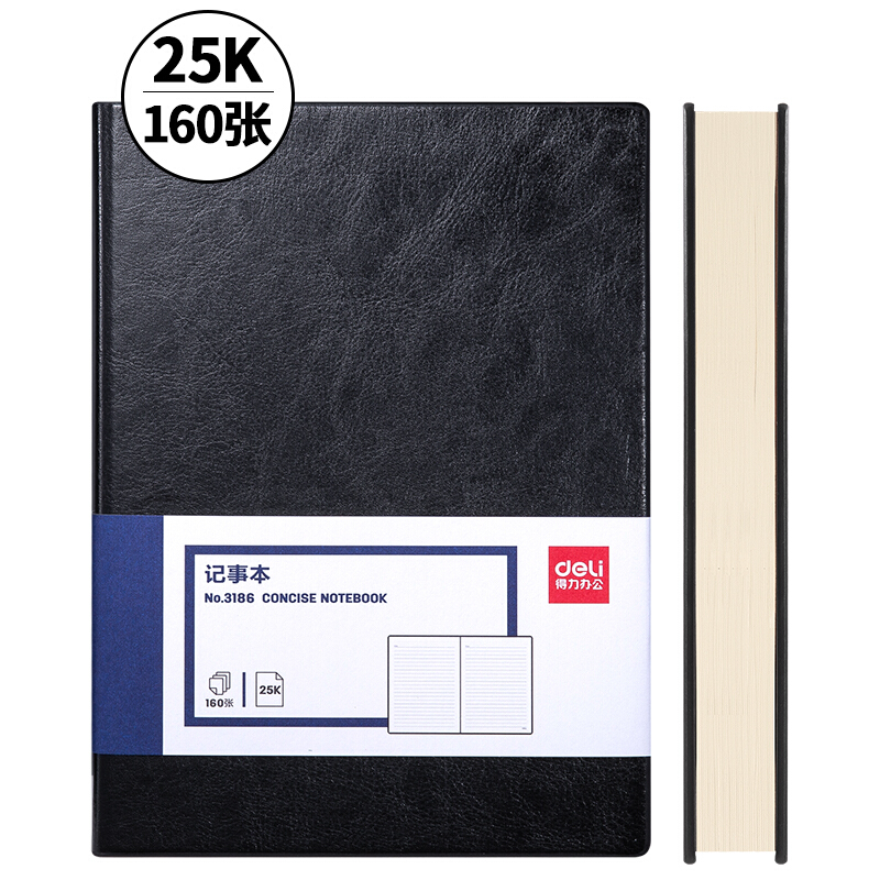 - 商品名称:得力(deli)25K160张加厚商务皮面本 办公会议记事本笔记本子文具蓝色3186